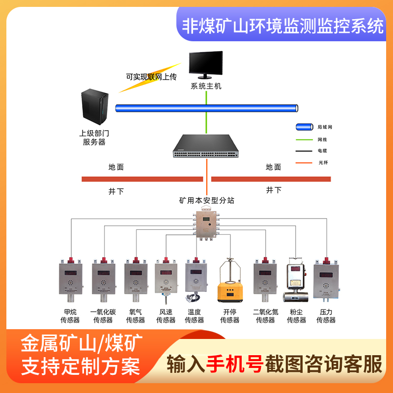 非煤矿山环境监测监控系统是主要用来监测甲烷浓度、一氧化碳浓度、二氧化碳浓度、氧气浓度、硫化氢浓度、矿尘浓度、风速、风压、湿度、温度、馈电状态、风门状态、风筒状态、局部通风机开停、主要风机开停等,并实现甲烷超限声光报警、断电和甲烷风电闭锁控制等功能的系统